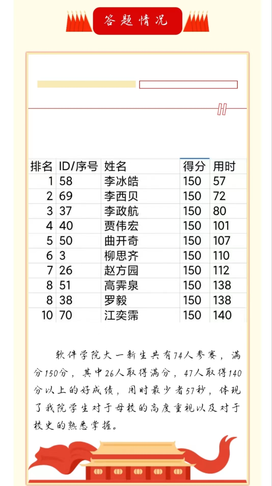 的历史沿革、重要事件、著名人物、校园文化等多个方面,将知识性与趣味性融于一体,以选择题的形式要求参赛的同学们在规定的时间内进行作答,最终根据答题的正确率和用时来决出优胜者。