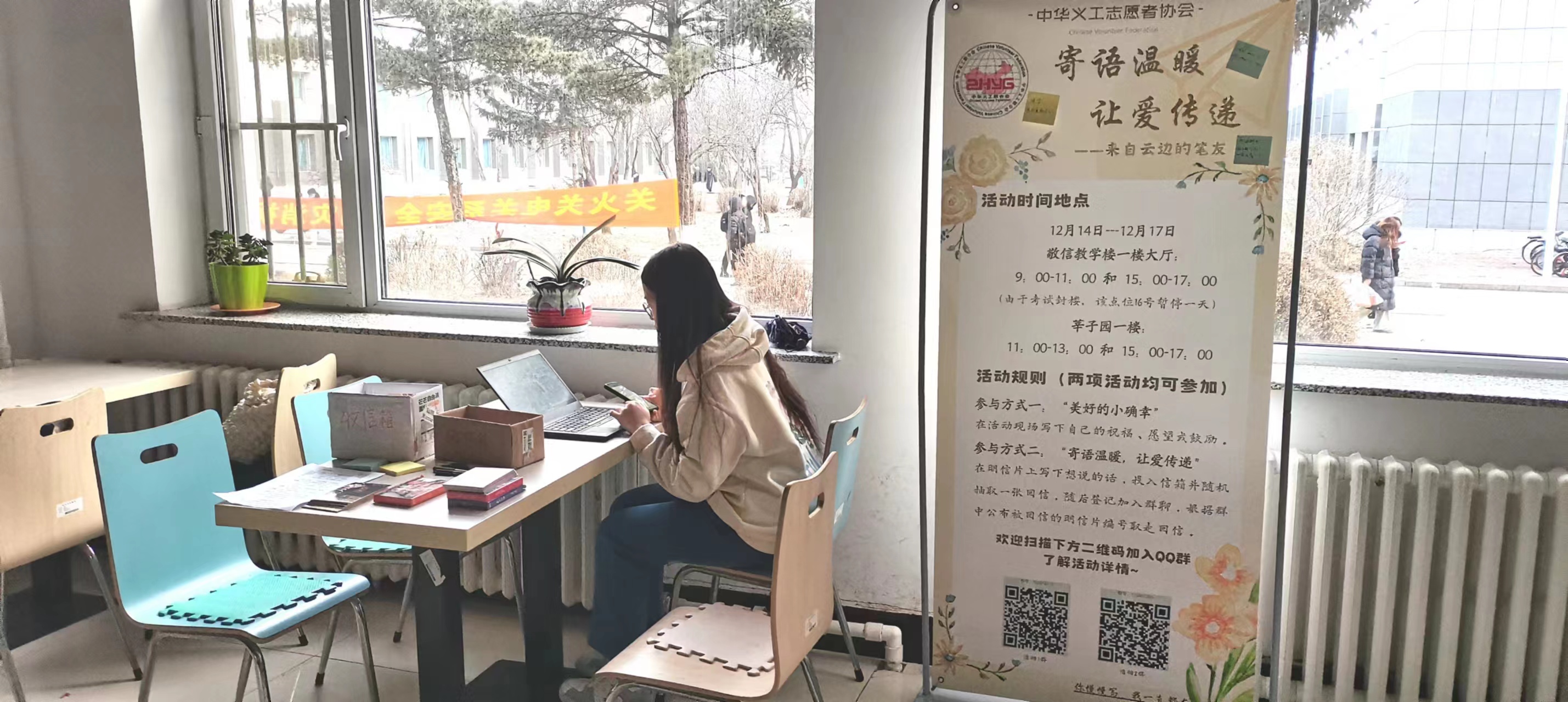 为促进校园文化交流、增强同学之间友谊。中华义工志愿者协会在考试月和新的一年来临之际举办“寄语温暖,让爱传递”活动,希望能够缓解同学们考试月的焦虑和压力,在新的一年给彼此送上最真诚的祝福,传达校园正能量,营造和谐、温馨的校园氛围。12月14日-12月17日,中华义工志愿者协会在莘子园一楼和敬信教学楼一楼大厅举办了“寄语温暖,让爱传递——来自云边的笔友”校园寄语活动。