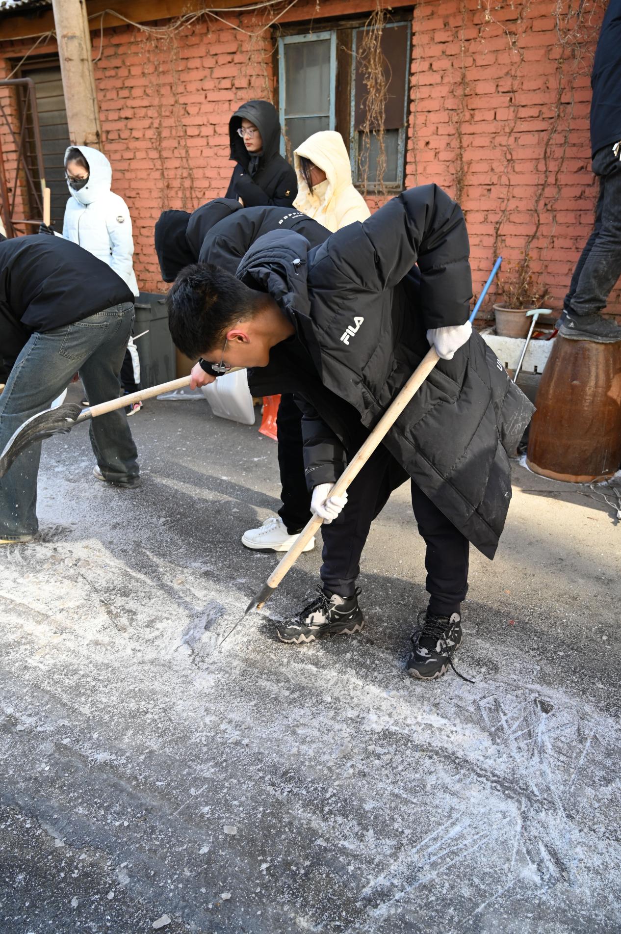 的同学们依然充满活力,热情投入到清扫冰雪的志愿服务行动中,历经了数个小时的分工合作和努力劳动,同学们终于将对应区域的冰雪清扫干净,得到了社区工作人员及居民的一致认可和高度赞扬。