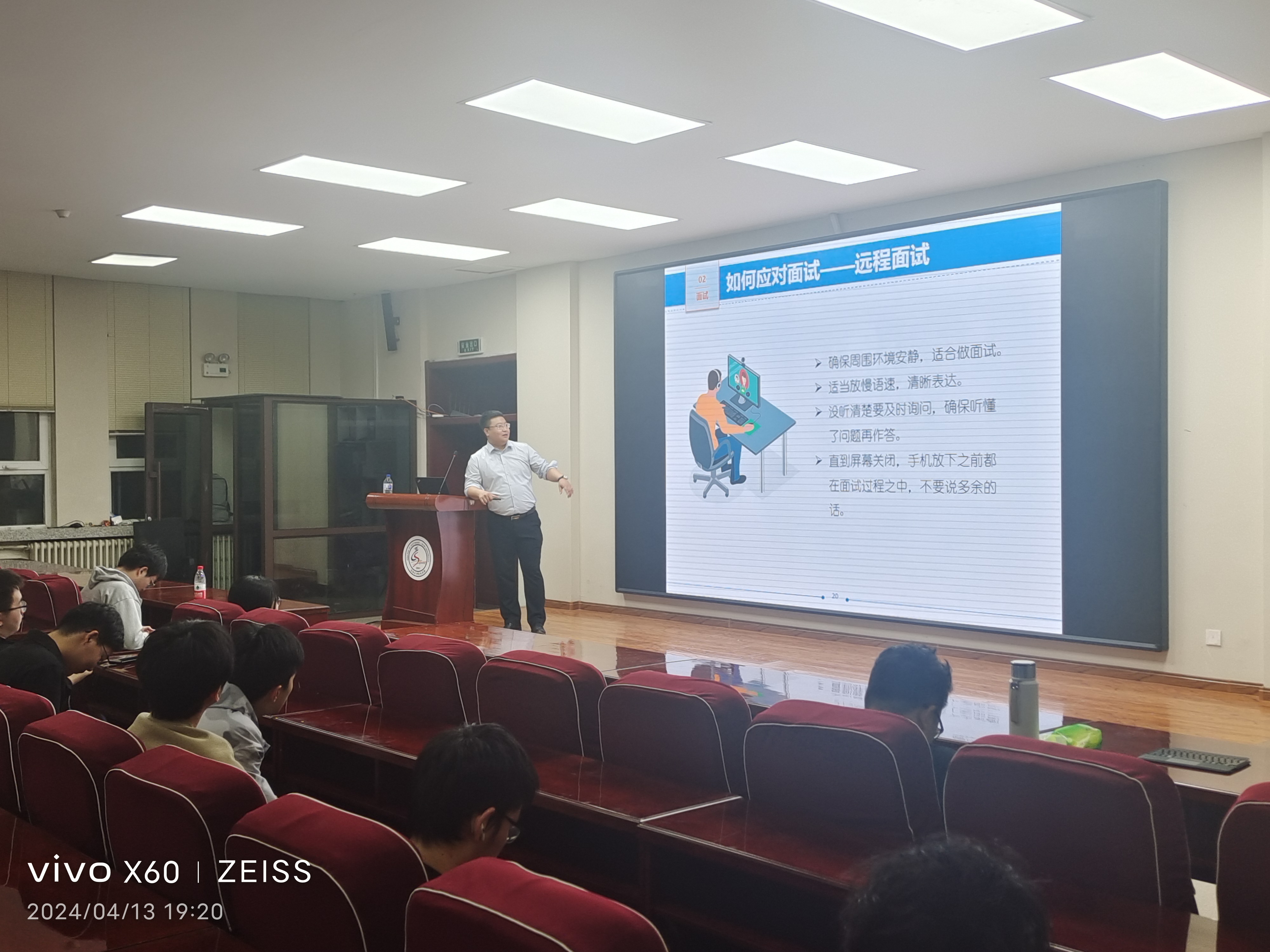 接着,主讲人结合其从事招聘工作的丰富经验,为同学们细致讲解简历制作的要点,强调个人简历必须突出实习经历和项目成果,展现个人特色和优势,并传授面试技巧,指出群体面试不只是个人的舞台,不能只注重表达个人观点,应注重融入团体,在团队协作中发挥自己的优势,为同学们从容应对面试提供一系列实用、宝贵的指导建议。