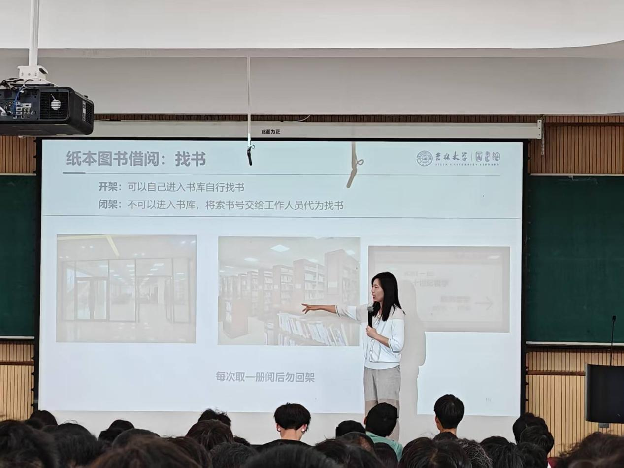 图书馆的整体布局、馆藏资源、入馆方式、开馆时间与官方网站等基本信息,帮助同学们初步建立对图书馆的宏观认识。随后,她详细演示了纸本图书的查阅、借阅与归还流程,包括如何通过系统检索图书、定位书架、办理借书证以及使用自助设备等实用操作,并逐步引导同学们掌握数字资源的检索与利用方法,包括电子书、数据库和畅销读物的在线阅读途径。