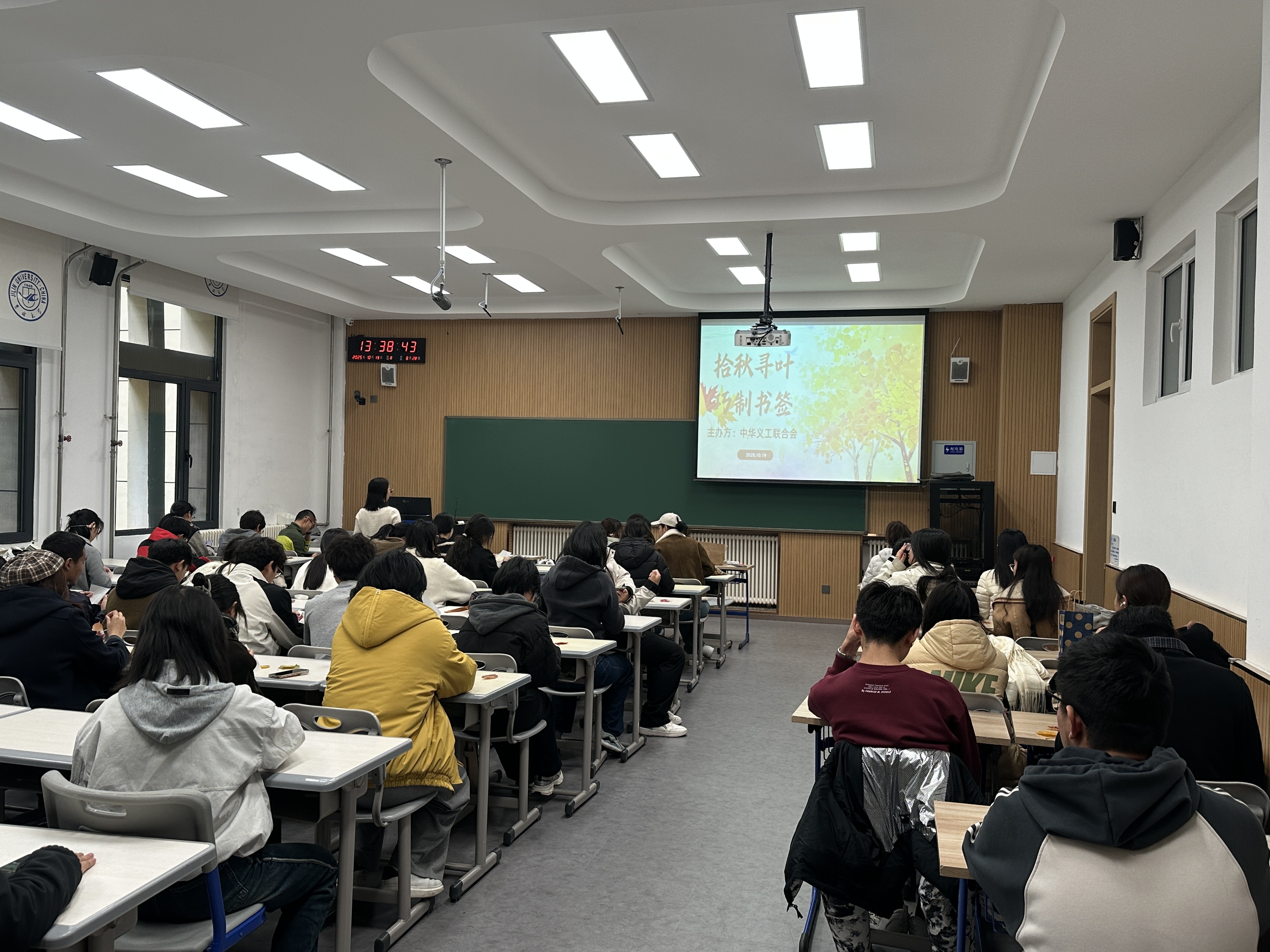 李四光楼111教室内暖意融融、创意涌动,“拾秋寻叶巧制书签”活动在此顺利开展。作为承载校园厚重历史与科学家精神的标志性建筑,李四光楼为这场融合自然之美与手工创意的活动赋予了独特文化内涵,活动启动仅一小时,便吸引近百名学子踊跃参与。