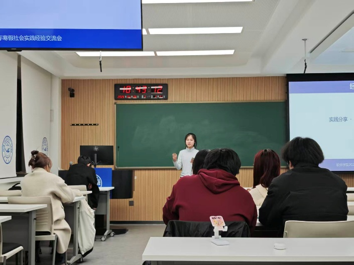 于4月8日在敬信教学楼E505举办2026年寒假社会实践经验交流会。乡韵同行振兴队、松江踏冰探秘队、江城忠魂缅怀队等多支优秀实践代表队齐聚一堂,依次登台分享实践历程与心得体会,共同交流成长、共话青春担当。