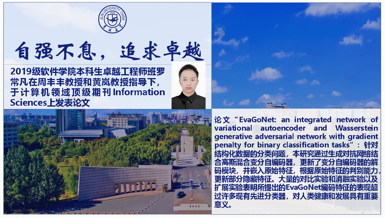 本科生邵永康,计算机学院本科生王子涵、胡剑铮、袁佳蔚)在2020年暑假进入2019级卓班班主任周丰丰教授的健康信息实验室开展大数据算法研究。整个暑假以及后面的时间里,该小组都在周教授的指导下刻苦探索相关算法的改进工作,每周不少于三次的组会讨论,超过了不少研究生的科研刻苦程度。该研究成果经历了多个顶会的一轮评审,遗憾被拒。但是该小组成员坚持不懈,反复修改完善,最终见证了该篇论文“EvaGoNet: an integrated network of variational autoencoder and Wasserstein generative adversarial network with gradient penalty for binary classification tasks”在计算机领域顶级期刊Information Sciences上发表。该工作还受到黄岚教授的悉心指导。2019级卓班在全班同学的努力下,荣获含羞草视频
