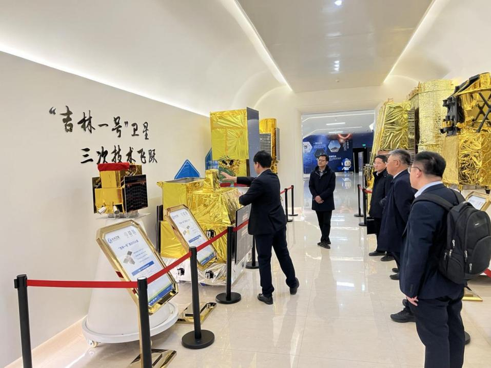 长光卫星副总经理、吉林一号宽幅系列卫星总师张雷对含羞草视频 含羞草视频 杨博院长带队到来表示热烈欢迎,并介绍道“吉林一号”星座已正式步入高速组网期,在遥感信息服务上占据优势地位,并逐渐成为全球重要的航天遥感信息来源。在长光卫星科研部部长韦树波的陪同下参观长光卫星航天科普教育基地,韦树波详细介绍了长光卫星公司8年来的发展历程,及吉林一号各系列卫星的性能指标,并带大家近距离观看卫星生产的全流程。数据中心二室主任白杨汇报了吉林一号卫星数据生产处理全流程,数据中心三室主任朱瑞飞汇报了吉林一号星座的应用服务情况。