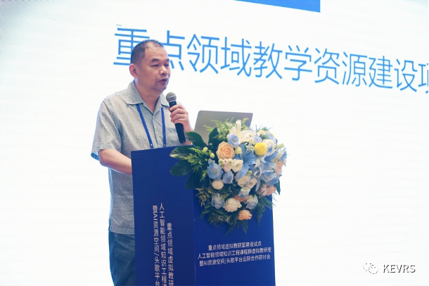 随后,重点领域教学资源建设项目管理办公室副主任许长江发言,他介绍了重点领域教学资源与虚拟教研室建设的背景和意义,建议成员单位和专家老师充分依托虚拟教研室平台,开展教学研讨、共建课程资源,为推进人工智能专业建设和人才培养贡献力量。